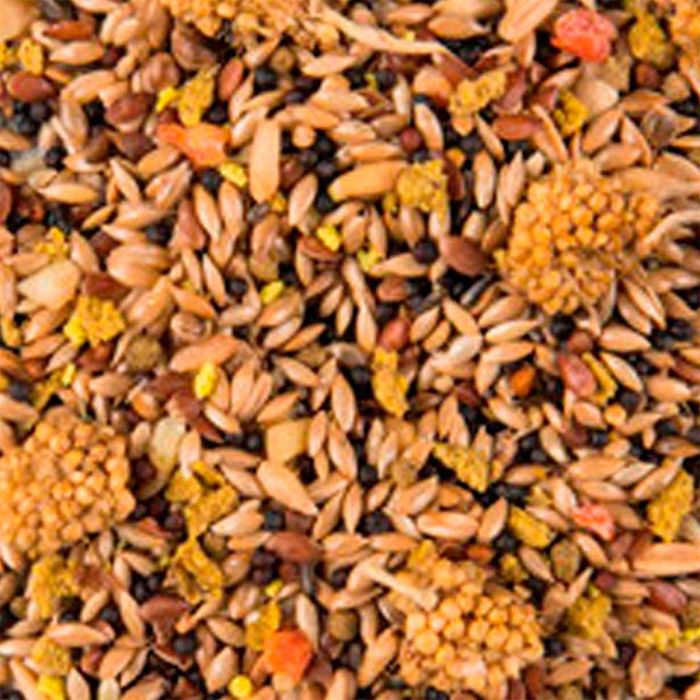 - Composición rica en proteÃnas y semillas de lino para un plumaje brillante y una muda fácil.