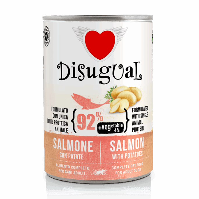 Comida húmeda monoproteica de Salmón para todo tipo de Perros que incluye vegetales en este caso las patatas.